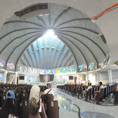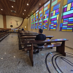 Na sequência, seguimos a pé para a Catedral São Francisco de Assis, que nos impactou com seu contraste arquitetônico super relevante. A linguagem brutalista, com o uso sincero e expressivo do concreto e do aço, rompe corajosamente com a expectativa tradicional que temos da arquitetura religiosa. A cobertura acolhedora em forma de mãos, a luz filtrada pelos vitrais coloridos e os 12 pilares internos organizam o espaço sagrado a partir de uma simbologia muito clara, porém com uma leitura totalmente contemporânea. É um edifício feito para ser provocante — e isso logo gerou discussões riquíssimas no grupo, o que é extremamente positivo e alinhado à essência questionadora do Caminhos.