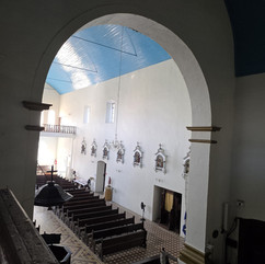 A Igreja Matriz Nossa Senhora da Graça acrescentou ao nosso roteiro outra camada histórica de extrema importância. Sua construção também faz uso do barro e do óleo de baleia na argamassa, garantindo sua durabilidade frente ao implacável ambiente litorâneo. Internamente, para além da beleza dos elementos litúrgicos — as imagens sagradas, as coroas, os crucifixos —, o que chama muita atenção de nossos olhares técnicos é a intervenção que reduziu a largura original da igreja. É uma adaptação marcante que altera por completo a proporção e a leitura espacial, evidenciando de forma muito clara como os edifícios históricos passam por ajustes físicos ao longo do tempo, que nem sempre são neutros ou silenciosos.