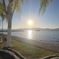 No final da tarde, retornamos à charmosa área do porto para acompanhar o espetáculo do pôr do sol. A paisagem parece se organizar de forma natural para a contemplação: o mar calmo ao fundo, as fachadas preservadas à frente e um detalhe urbano extremamente relevante que faz toda a diferença — a ausência de fiação aérea. O enterramento da rede elétrica permite uma leitura limpa, pura e desobstruída das edificações, valorizando imensamente o conjunto histórico. Próximo dali, a imagem de Joaquim Marques Lisboa estabelece um ponto de referência simbólico muito forte, ligado à nossa história naval brasileira e à própria relação visceral da cidade com as águas.